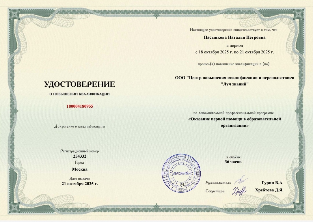 Удостоверение о повышении квалификации по доп.профессиональной программе- Оказание первой помощи в образовательной организации